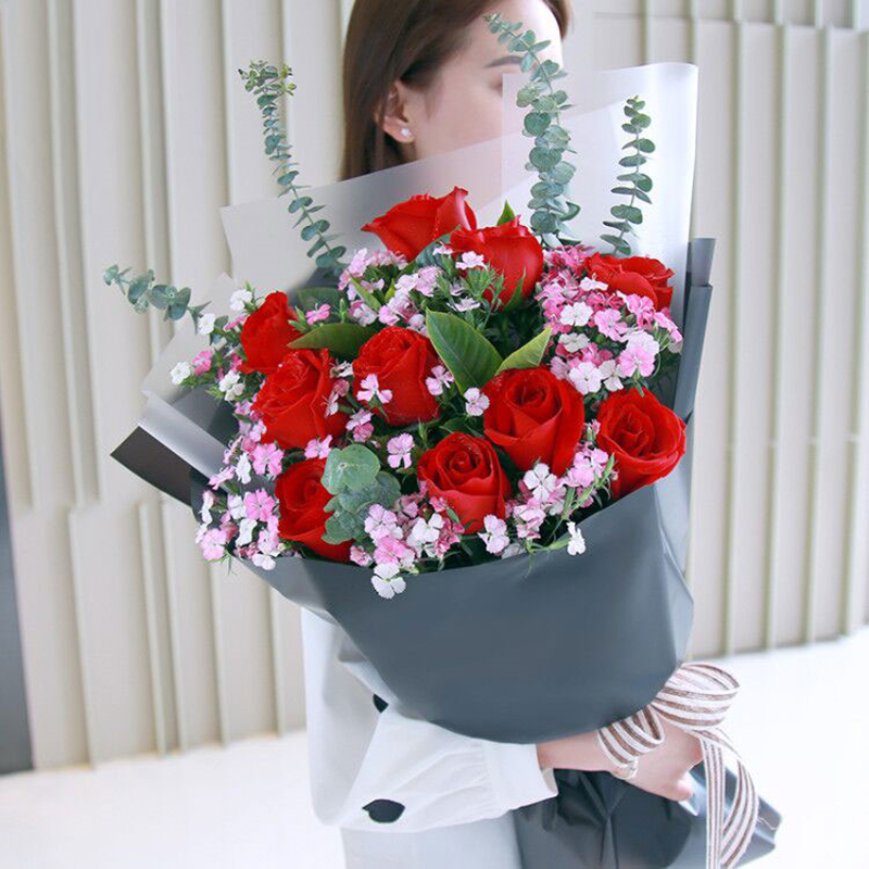 11朵红玫瑰尤加利花束女友老婆生日祝福礼物